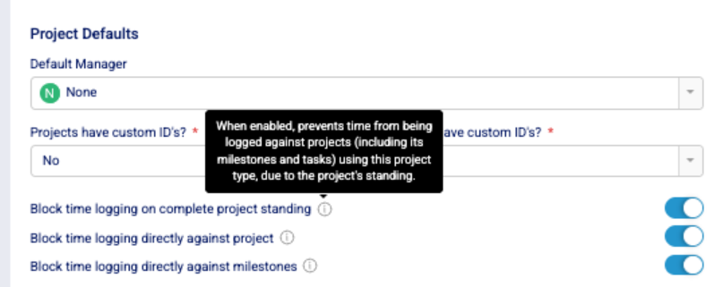 Additionally, Admins can prevent time from being logged on Projects whose status maps to a completed standing, ensuring no further time is recorded once a Project is effectively complete.