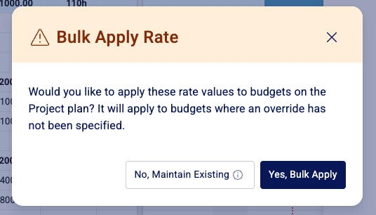 If users make changes on the rate card drawer, when they click OK or close the drawer it will trigger a modal allowing users to choose whether to apply change to rate values in bulk to the project plan.