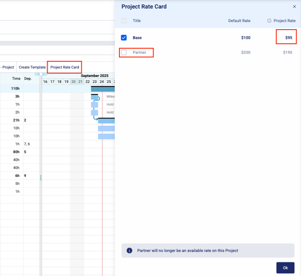 Once your rate card is set-up, you can edit the Project Plan and you'll see that the rates available there are exactly what you've configured in the rate card. Furthermore, if you drop in a project, those rates will be adjusted according to the rate card.